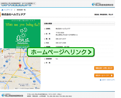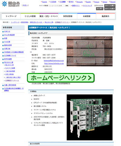 岡山県産業振興財団 おかやま企業情報ナビに掲載されました →2015年の新着ニュースに戻る 岡山県産業振興財団 おかやま企業情報ナビにて、市内製造業の企業情報データ ベースに、株式会社ヘルヴェチアが新規に登録されました 2015年7月10日 岡山市企業概要データベースに掲載されました 岡山市の公式ホームページにて、市内製造業の企業情報データベースに、株式会社ヘルヴェチアが新規に登録されました 2015年6月16日