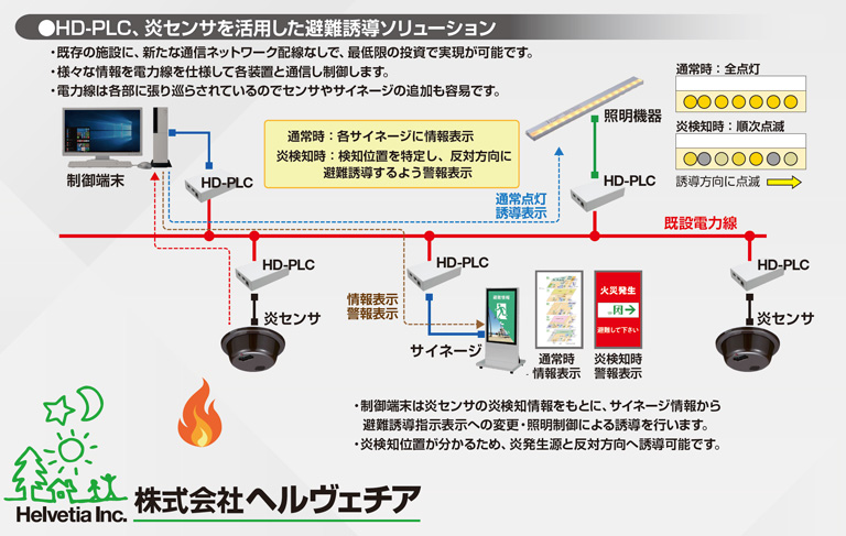 炎センサの検知情報をHD-PLC(電力線通信)を使用して制御端末に通知します。 制御端末は炎センサの検知情報をもとに、様々な警報情報を発信することができます。(サイネージ情報から警報情報に切り替え、照明制御による誘導など)